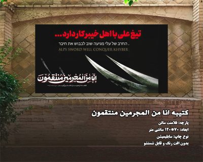 کتیبه انا من المجرمین منتقمون | مشکی جنس پارچه: فلامنت ساتن ابعاد: 70*120 سانتی متر نوع چاپ: سابلیمیشن بدون افت